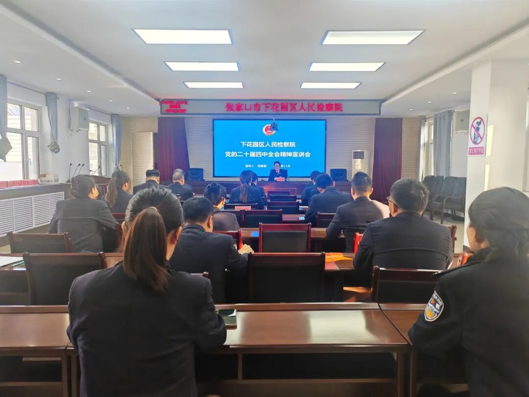 为深入学习贯彻党的二十届四中全会精神,切实把干警的思想和行动统一到党中央决策部署上来,11月27日,下花园区人民检察院召开党的二十届四中全会精神宣讲会。院党组书记、检察长班智慧作专题宣讲,全体干警参加。