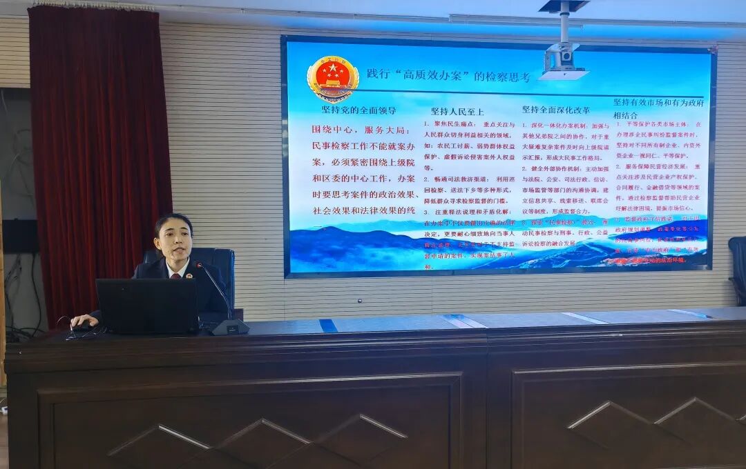 为切实提升民事检察办案质效,近日,下花园区人民检察院组织开展民事检察指导性案例和典型案例传导培训,本次培训由参加了“全国检察机关第3期民事检察指导性案例和典型案例专题研修班”的业务骨干祁玉春主讲。祁玉春在国家检察官学院培训期间,认真聆听最高检及学院专家授课,并与全国各地业务骨干深入交流,学习了先进理念、更新了知识储备。为了将学习成果转化为推动检察工作高质量发展的动力,她将培训重点总结提炼,为全体干警展开了一场兼具理论知识和实践案例的精彩授课。