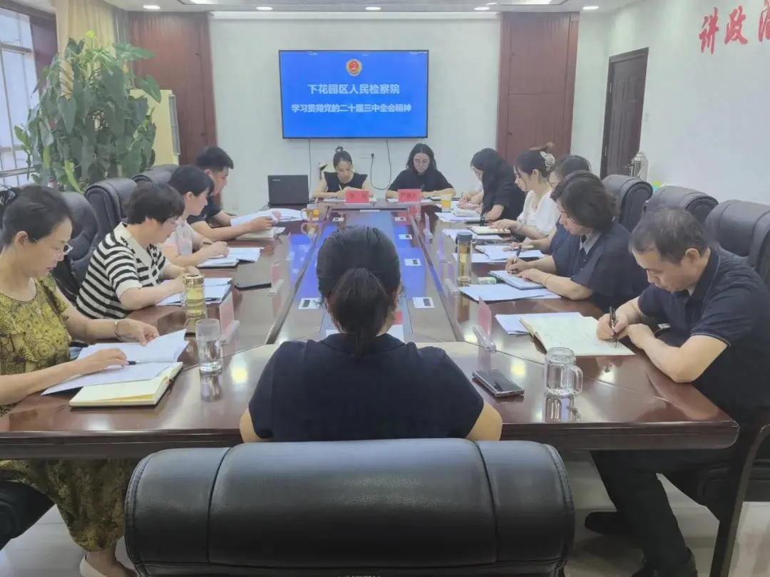 近日,下花园区人民检察院召开党组理论中心组(扩大)会议,集中学习、传达党的二十届三中全会精神,结合下花园检察实际,研讨学习推动工作发展的新思想,研究确定贯彻落实的着力点和具体措施。会议由院党组书记、检察长班智慧主持,班子成员及中层副职以上干警参加。
